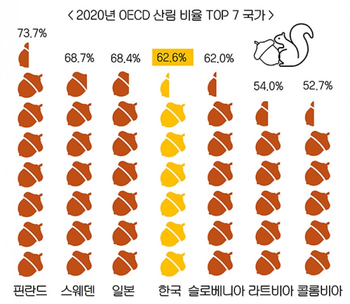 Trend Insight는 주목할 만한 사회와 시대의 흐름을 다양한 관점에서 함께 풀어내는 칼럼입니다. 격주로 여러분과 만나볼 칼럼 Trend Insight에 많은 관심과 사랑을 부탁드립니다.[Research Lounge] 콘텐츠의 자원이 되는 숲을 보다 ㈜조사연구컨설팅 올림은 2023년부터 한국임업진흥원에서 진행하는 숲과 관련된 다양한 조사연구를 맡아 수행하고 있다. 그러다 보니 자연스럽게 차를 운전하면서 창문 밖으로 스치는 산이나 숲을 보면 나도 모르게 친근감이 든다. 특히 푸르름으로 뒤덮인 여름 산을 보고 있노라면 우리의 산천이 참으로 많은 숲으로 아름답게 포장되어 있음을 다시금 깨닫게 된다. 그래서 무릎 관절염으로 등산을 자주 하지 못하는 처지인데도 꾸역꾸역 나무와 숲을 만나러 가게 된다.11월 중순, 가을 색으로 영롱한 숲을 만나러 남산에 다녀왔다. 10월에 열린 ‘남산 하늘숲길’이 궁금해서였다. 대중교통으로도 쉽게 접근할 수 있는 데다가 휠체어, 유아차는 물론이고 거동이 불편한 고령자까지 편안하게 오르내릴 수 있도록 완만한 길이 굽이굽이 이어져 있었다. 둘레길로 쉽사리 즐기지 못하는 처지에서 보자면 정말 고마운 일이다. 카메라에 아름다운 숲의 모습과 색을 카메라에 담고 있자니 정말 우리나라의 숲은 어디에 내어놔도 손색이 없는 또 다른 콘텐츠의 자원이 아닐까 하는 생각이 들었다.우리나라의 산림 비율은 2020년말 기준으로 62.6%. 전체 국토면적 10,041천ha 중 6,298천ha가 산림이라고 한다. 이 비율은 경제협력개발기구(OECD) 국가 중 핀란드, 스웨덴, 일본에 이은 4위에 해당한다. 그러니까 우리나라는 세계에서도 내로라하는 산과 숲의 나라인 셈이다. 지난여름, 차로 고속도로를 달려 강원도에 놀러 가던 길이었다. 보조석에 앉아서 몇 시간 동안 이어지는 창밖 풍경을 바라보고 있던 딸이 이런 말을 했다.“학교에서 우리나라는 천연자원이 부족해서 교육을 통한 인력 자원이나 콘텐츠와 같은 무형의 자원으로 국가경쟁력을 높인다고 배웠거든. 그런데 봐봐. 저렇게 숲이 많잖아. 저것도 자원일 텐데, 숲을 활용한다면 우리나라도 자원 부국 아닌가?”숲을 채우고 있는 나무는 물론이고, 나무의 열매인 밤, 감, 은행, 도토리, 산딸기와 같은 과실류, 표고, 송이, 능이, 목이 등의 버섯류, 더덕, 고사리, 고비, 도라지, 취나물, 땅두릅, 쇠비름 등의 산나물류, 천마, 작약, 결명자, 구절초, 당귀와 같은 약초류, 오미자, 오갈피나무, 구기자나무, 옻나무 등의 약용류, 그리고 야생화, 이끼류뿐만 아니라 수액이나 나무뿌리, 나무순도 모두 숲이 주는 자원이다. 이런 자원은 순수하게 자연이 우리에게 주는 것일 수도 있지만, 우리가 키우고, 가꾸고, 다듬어서 자원으로도 만들 수 있는 것이다. 예를 들어 한국임업진흥원의 홈페이지에 소개된 산나물인 쇠비름은, 산과 들에서 흔히 볼 수 있는 나물로 그동안은 사람들의 관심을 끌지 못했는데, 지금은 아토피, 여드름 등 피부질환 대한 효능과 오메가3와 칼륨이 풍부하다는 사실이 알려지면서 많은 관심을 받고 있다고 한다. 쇠비름 효능과 먹는 방법이 궁금하다면 한국임업진흥원 홈페이지를 방문하면 된다. https://www.kofpi.or.kr/info/imupStory/forestStory_01view.do출처: 한국임업진흥원 홈페이지그런데 이제 이런 숲의 자원의 활용도가 하나 더 늘어나서 우리 일상에 자리 잡아가고 있다. 바로 치유와 힐링의 자원으로 말이다. 숲의 공기를 마시면서 자연의 흐름을 안으로 들이고, 나무를 보면서 채움과 비움의 뜻을 배우고, 숲의 맛이 담긴 자연식을 먹으면서 자연의 건강을 채우고, 숲속의 시공간에서 일상을 벗어나 자신을 뒤돌아보는 시간을 갖는다. 숲은 우리의 시공간을 즐거움과 기쁨으로 채울 수 있는 최적의 자원인 셈이다.그래서 그런지 요즘 ‘숲 치유’가 인기여서, 산림청과 지방자치단체들이 운영하는 ‘치유의 숲’에 사람들이 몰린다고 한다. 특히 피톤치드, 음이온 등을 많이 내뿜는 편백나무나 잣나무, 소나무 숲에 머물 수 있는 곳이 인기이다. 현재 치유의 숲은 국립 21곳, 공립 44곳, 민간 2곳으로 총 67곳이 운영되고 있다. 산림청의 국립 치유의 숲 이용자 조사만 봐도 증가 추세를 확인할 수 있는데, 2021년 47만 1,769명에서 2024년 60만 6,089명으로 3년 새 28%나 증가했다.이렇게 인기가 있다 보니 각 지자체에서는 예산 투입해서 다양한 프로그램이나 설비를 갖추고 있다. 단순하게 숲길을 걷는 것에서 벗어나 물을 활용한 수치료, 명상, 다도, 산림욕, 전문장비를 이용한 건강 체크까지를 방문자에게 제공한다. 일상의 스트레스를 해소하기 위해 음악, 그림, 영화, 문학과 같은 콘텐츠를 소비하는 것처럼 이제는 숲도 치유의 콘텐츠로 시민권을 획득한 셈이다.개인적으로도 치유의 콘텐츠인 숲과 인연이 있다. 코로나가 한창이던 시기, 고려대학교 연구교수로 있으면서 산림과학원의 의뢰를 받아 ‘산림치유 기능 확대를 위한 산림휴양의학 도입 방안 연구’를 6개월간 진행하고 보고서를 작성한 적이 있다. 힐링과 치유의 단계에서 조금 더 나아가, 휴양의학의 자원으로 숲으로 이용하려면 어떻게 해야 할지를 독일, 뉴질랜드, 영국, 미국, 일본 등의 사례를 기반으